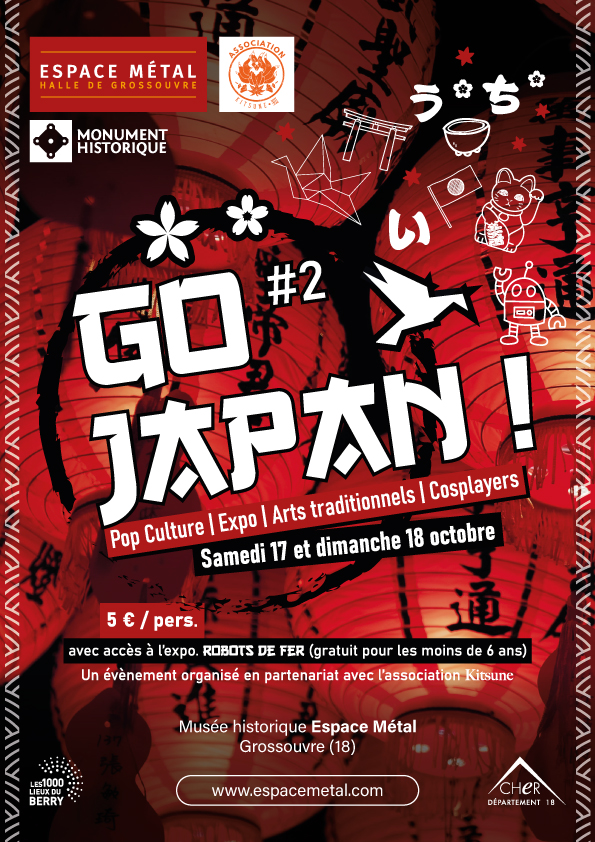 Pour accompagner l’exposition Robots de fer : plongez dans la grande odyssée des super-héros japonais !, l’Espace Métal de Grossouvre se pare à nouveau de ses habits de lumières pour devenir le temple du pays du soleil levant ! Cette seconde édition de Go Japan ! prendra des airs de véritable matsuri grâce à la collaboration de l’association Kitsune, spécialisée dans la diffusion de la culture japonaise.